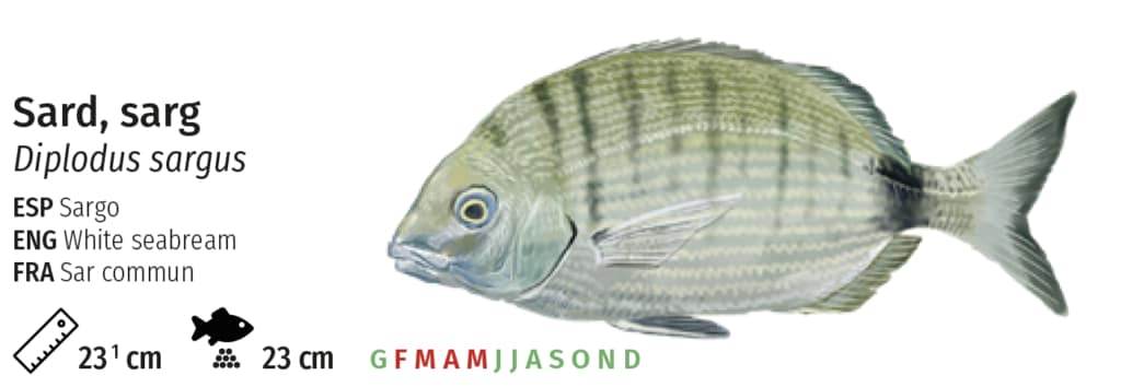 Je nach Bedingungen lassen sich Geißbrassen, Marmorbrassen, Doraden oder auch Makrelen fangen. In der Nähe der Mündung des Río Fluvià ziehen vermehrt Wolfsbarsche ins Küstenwasser. Achtung Wind: An sehr windigen Tagen lohnt es sich oft, bis zum Sonnenuntergang zu warten.