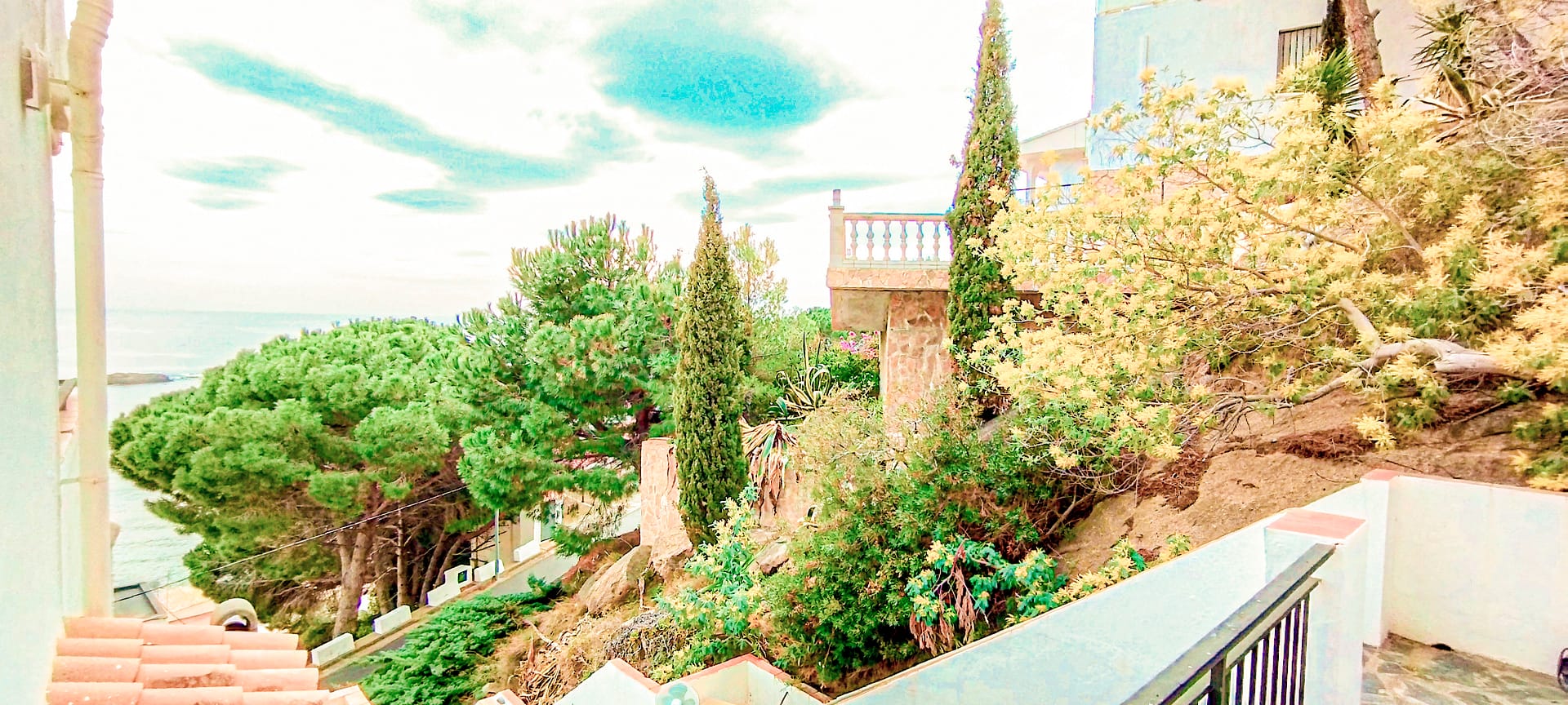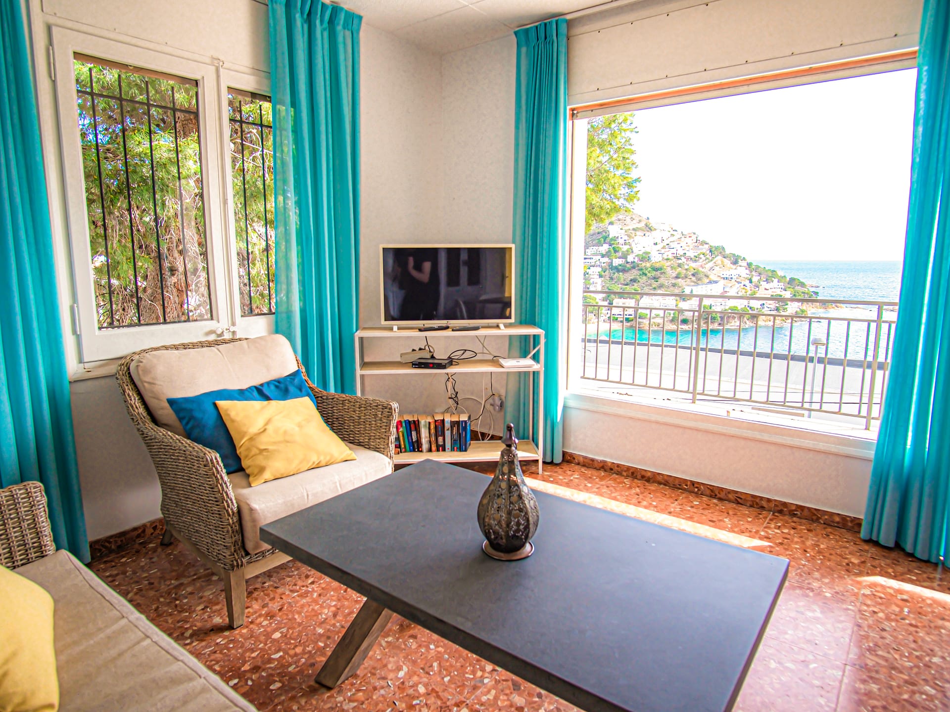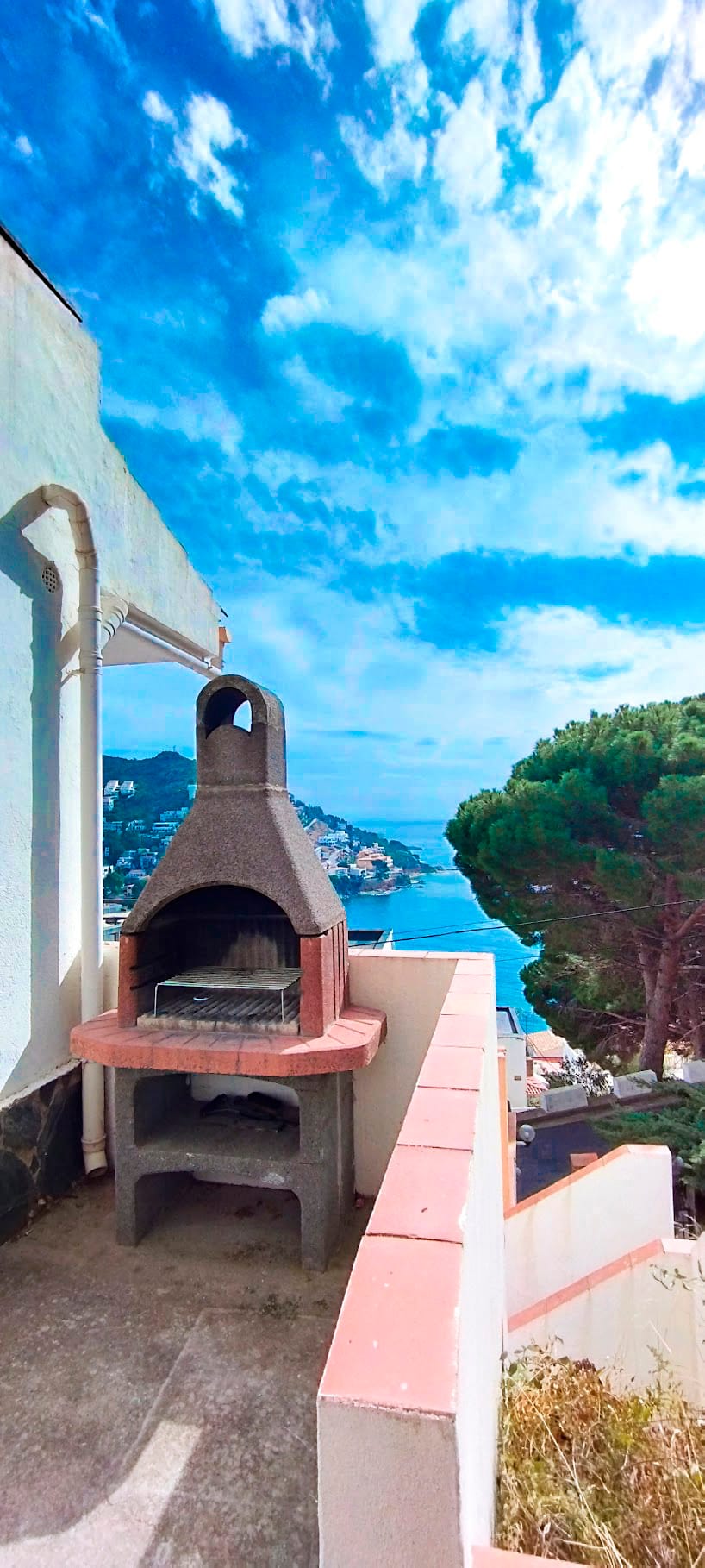 Unsere FeWo 1 bietet einen atemberaubenden Panoramablick auf das Meer (der Strand ist nur 130 Meter entfernt) und verfügt über eine 17 m² große Terrasse (8 Meter breit x 2,1 Meter tief), ausgestattet mit Sonnenschirm, Tisch, Stühlen und Liegen.