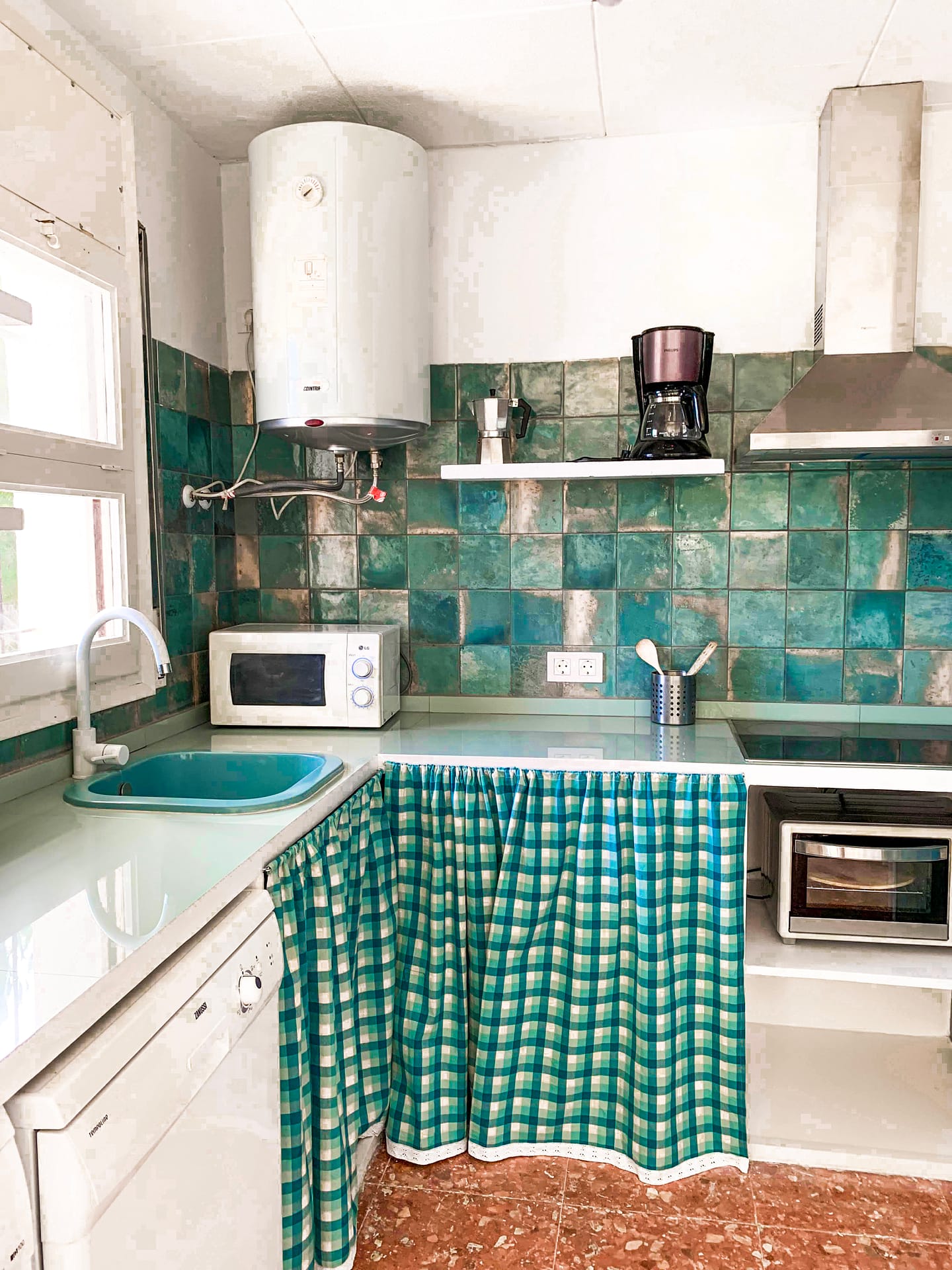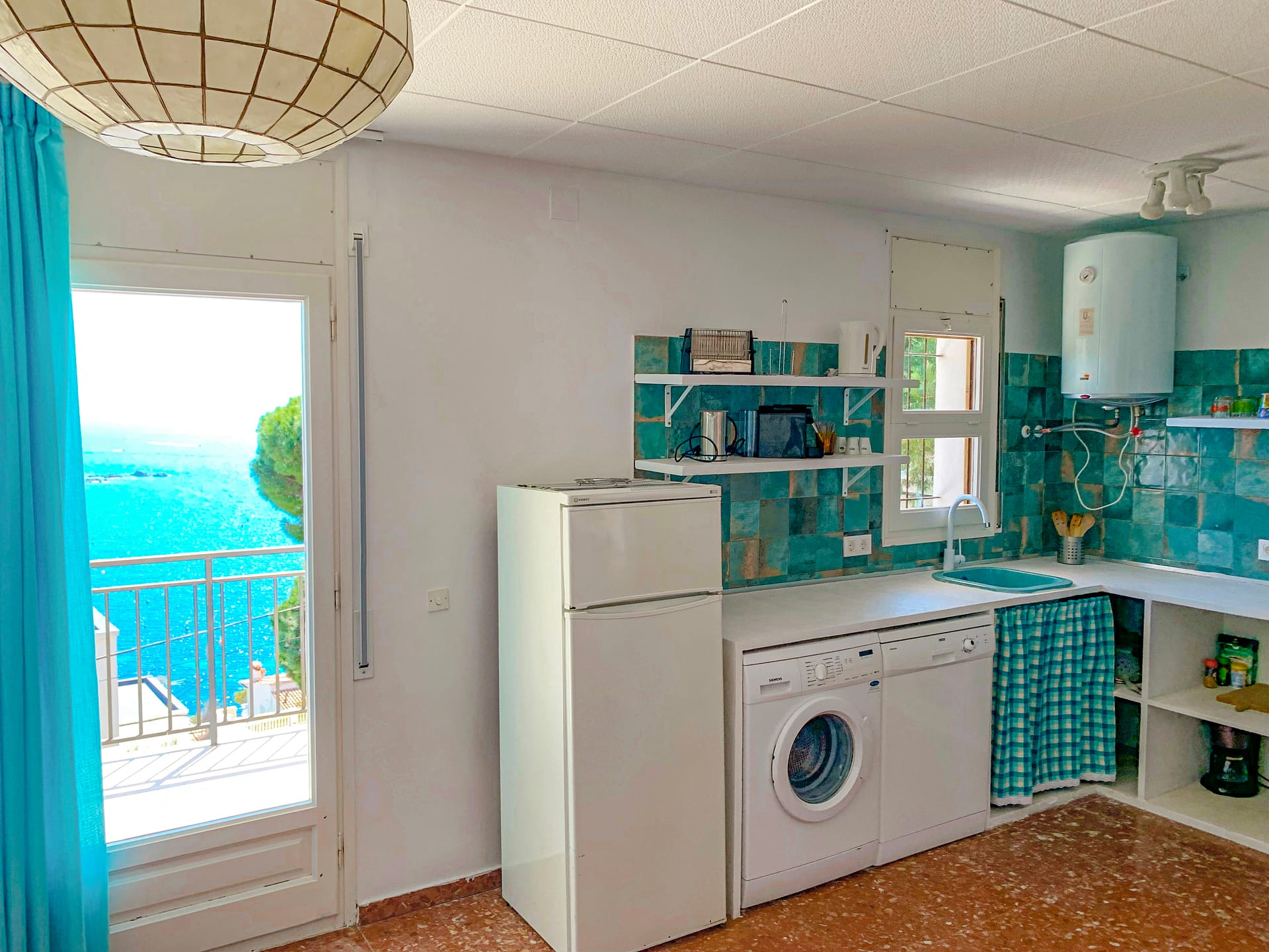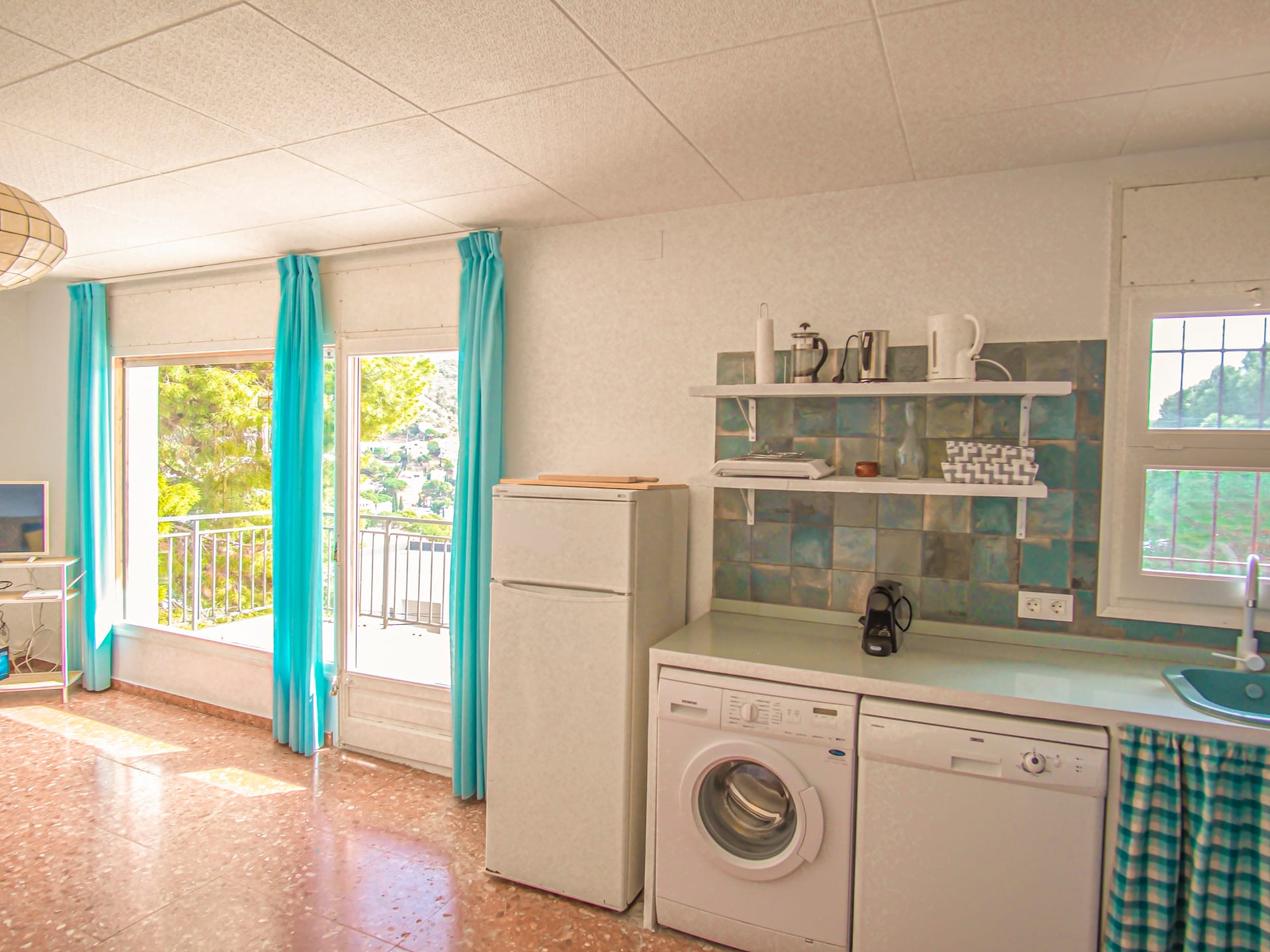 Die Küche mit mediterranem Flair ist ausgestattet mit Geschirrspüler, Elektrogrill, Cerankochfeld, Kühlschrank mit Gefrierfach, 2 Kaffeemaschinen (Filter und Nespresso), Toaster, Wasserkocher, Mikrowelle und Waschmaschine.