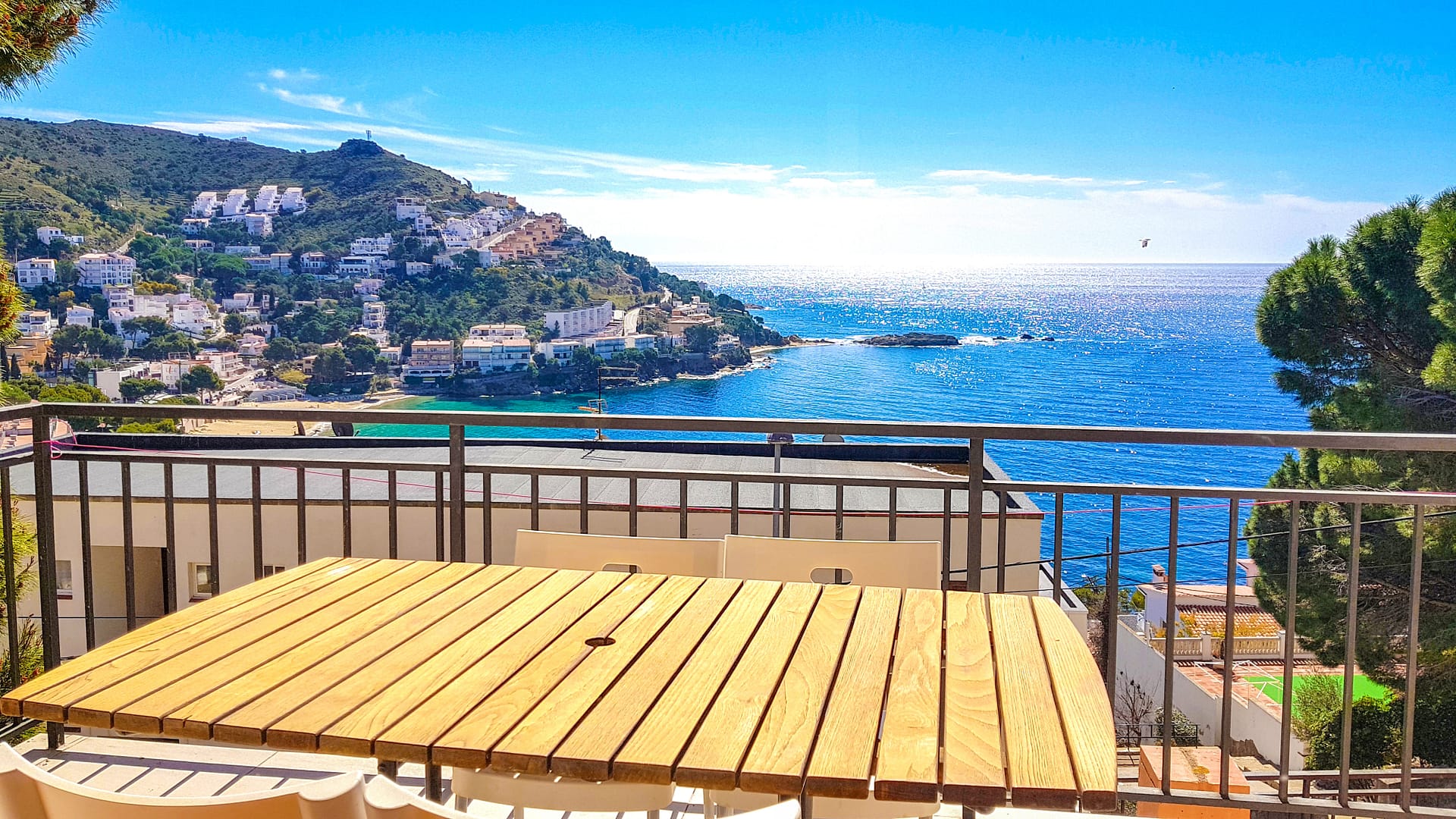 Apartment 1 offers an impressive panoramic sea view (the beach is only 130 meters away) and has a 17 m² terrace (8 meters wide x 2.1 meters deep), equipped with a parasol, table, chairs, and sun loungers.