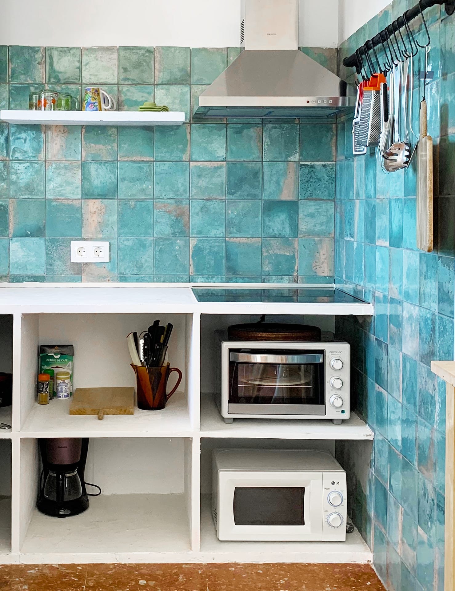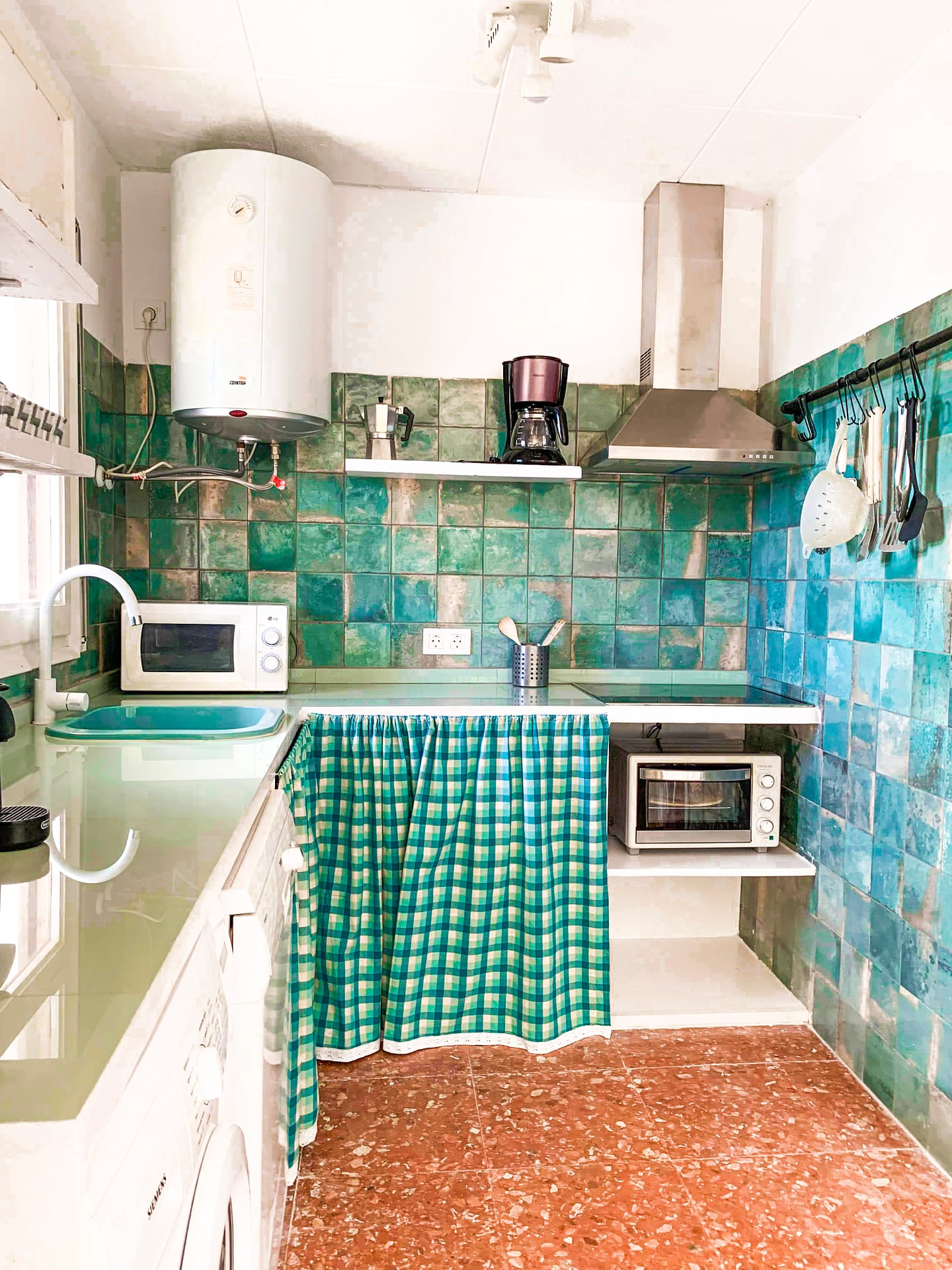 The Mediterranean-style kitchen is equipped with a dishwasher, electric grill, ceramic hob, fridge with freezer, 2 coffee makers (filter and Nespresso), toaster, electric kettle, microwave, and washing machine.