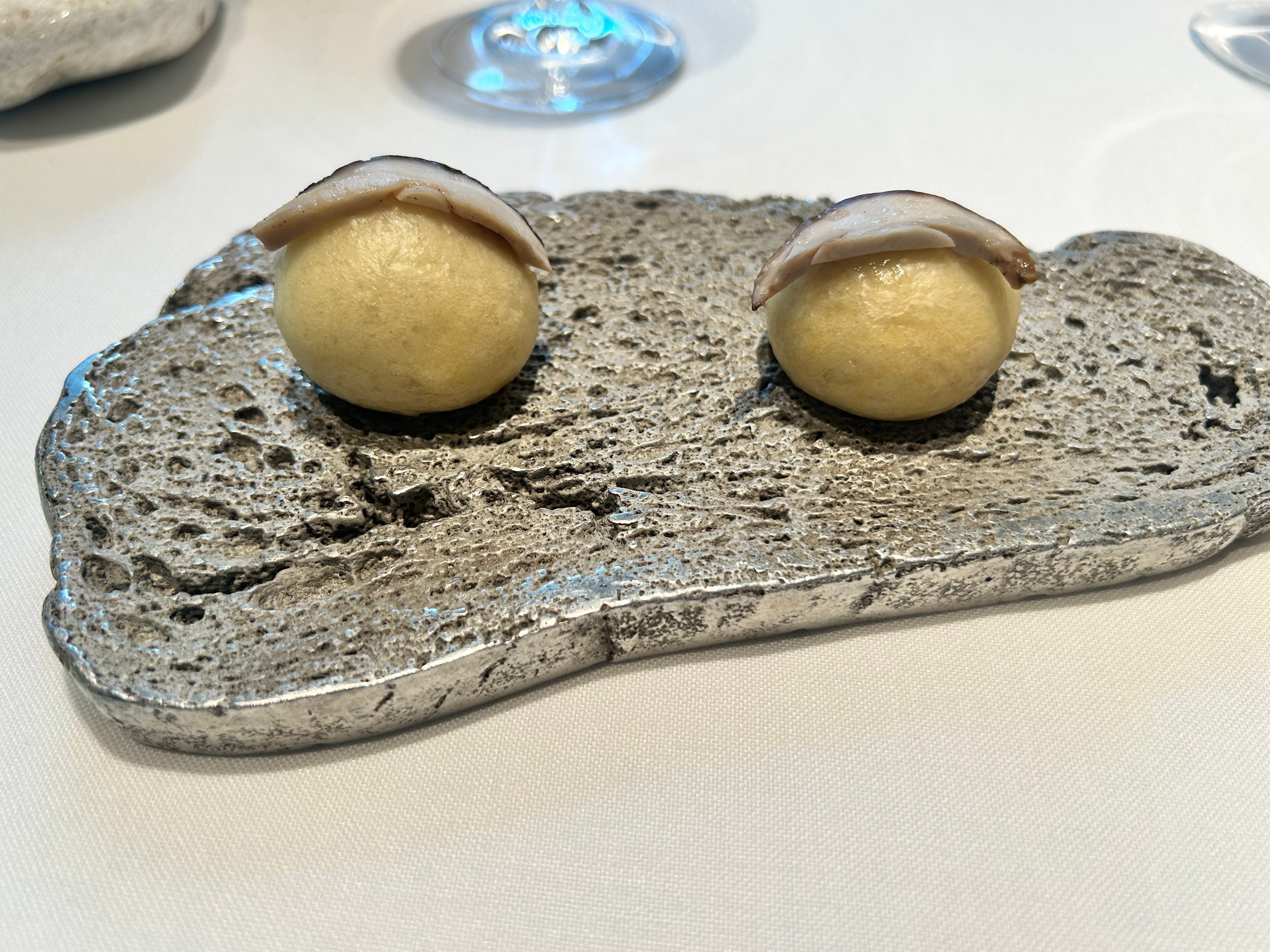 Les gambas de Roses, parfaitement snackées à la plancha par le chef Joan. Les anchois « papillon » faits maison sont également excellents — poissons de beau calibre, présentés avec les deux filets encore reliés par la queue.